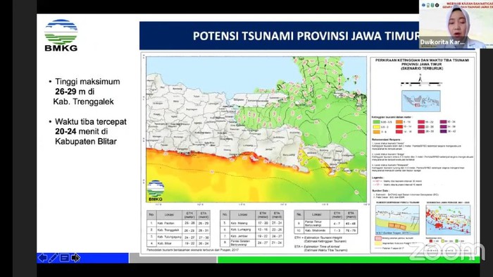 Kabar Trenggalek - Hasil kajian Badan Meteorologi Klimatologi Dan Geofisika (BMKG) menjelaskan potensi tsunami akibat gempa bumi di wilayah pantai selatan Jawa Timur. Menurut hasil kajian tim ahli BMKG, di kawasan pantai perairan Kabupaten Trenggalek potensi tsunami paling tinggi dengan 26 sampai 29 meter di perairan selatan Jawa Timur dari gempa berkekuatan 8,7 skala richter.Dwikorita Karnawati, Kepala BMKG, mengatakan, potensi genangan tsunami bisa mencapai 22 meter. “Ini sampai masuknya juga menjorok cukup jauh ke daratan," ujarnya dalam webinar Kajian Mitigasi Gempa Bumi Dan Tsunami Di Jawa Timur (28/05).Sedangkan, gelombang tsunami tercepat akan sampai di Kabupaten Blitar dengan waktu tempuh gelombang dari pusat gempa selama 20-24 menit.Dwikorita menjelaskan bahwa potensi tsunami di Jawa Timur, bisa dilacak dari sejarah gempa di Indonesia. Sejak 2008, memang sering terjadi gempa dengan beragam magnitudo di Indonesia. Magnitudo adalah sebuah besaran yang menyatakan secara jelas tentang seberapa besarnya energi seismik yang dipancarkan oleh sumber gempa.Sejak 12 tahun terakhir, jumlah gempa paling banyak terjadi pada 2019, yaitu 11.920 kali gempa. Sedangkan pada 2020, tercatat jumlah gempa terjadi 8.258 kali. "Fenomena tersebut berdasarkan kajian, perlu diwaspadai karena gempa dengan magnitudo besar selalu diawali dengan banyak gempa dengan magnitudo kecil," kata Dwikorita.Berdasarkan catatan BMKG, ada aktivitas gempa selama 5 tahun terakhir di Jawa Timur. Oleh karena itu, Dwikorita meminta kepada seluruh pemerintah daerah, termasuk di Trenggalek, untuk meningkatkan kewaspadaan dan mitigasi bencana (segala upaya untuk mengurangi risiko bencana) sebelum terjadi gempa.